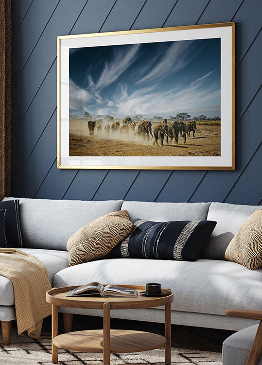 Tato mocná fotografie divoké zvěře zachycuje majestátní stádo slonů, jak se řítí prašnou savanou pod širým nebem. Scéna vyzařující syrovou sílu, jednotu a divokého ducha Afriky se stává velkolepým uměleckým dílem, které oslavuje přírodu, svobodu a nádheru divočiny.