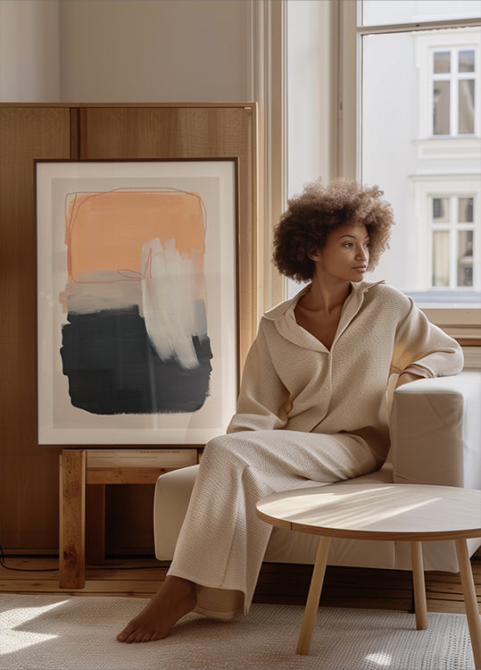 Moderní abstraktní plakát s výraznými tahy štětcem v teplé broskvové, vrstvené šedé, sytě černé a jemné bílé. Texturované tahy a kontrastní tóny vytvářejí pozoruhodnou kompozici, která vyvažuje teplo a hloubku – ideální pro minimalistické interiéry, skandinávské dekorace nebo stylové stěny galerie.