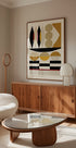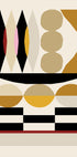 Výrazný abstraktní plakát inspirovaný Bauhausem s geometrickými tvary v zemitých tónech, jako je okrová, béžová a černá, doplněný červenými a růžovými akcenty. Čisté, strukturované tvary vytvářejí pozoruhodnou vizuální rovnováhu, která spojuje moderní minimalismus s designem z poloviny století – ideální pro současné interiéry nebo stěny galerie inspirované retro.