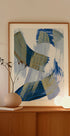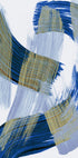Výrazný abstraktní plakát s výraznými tahy štětcem v tmavě modré, tlumené zlaté a jemné bílé na čistě bílém pozadí. Plynulé tahy a vrstvené textury vytvářejí pocit pohybu a rovnováhy – dokonalé umělecké dílo pro moderní interiéry, minimalistické dekorace nebo stěny skandinávských galerií.