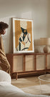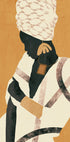 Poutavý minimalistický plakát zobrazující elegantní Afričanku s výraznými šperky a vzorovaným šátkem. Zemité žluté a černé tóny mísí moderní abstrakci s kulturním bohatstvím, což z ní dělá silný prvek v moderních interiérech inspirovaných boho.