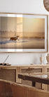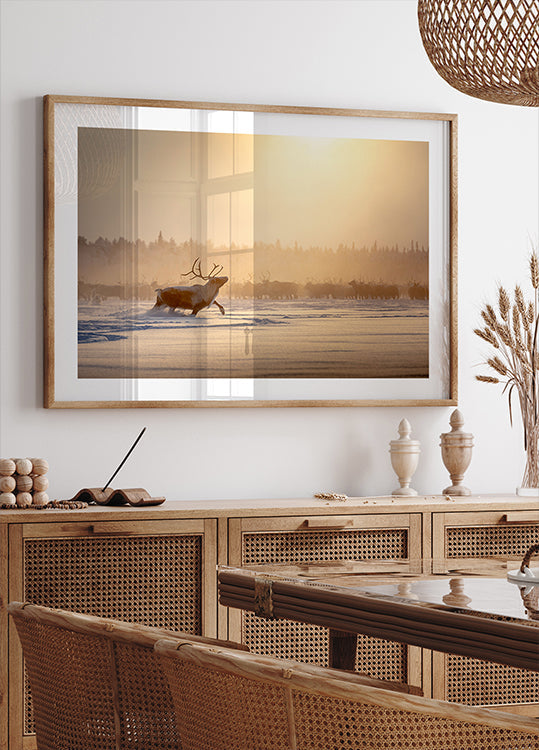 En majestætisk alfa-rensdyr står forrest i et sneklædt landskab, geviret tegnet skarpt mod den kolde luft, mens en stille flok anes i baggrunden. Gyldent vinterlys bryder gennem frosten og skaber et poetisk møde mellem styrke og ro. Et stemningsfuldt motiv af Patrik Minar. Perfekt til at bringe nordlig ro og eventyr ind i hjemmet.