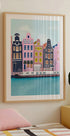 Et poetisk blik på Amsterdam af Petra Lizde: slanke kanalhuse med gavle spejler sig i det stille vand, mens en lille båd glider forbi under en rosa aftenhimmel. Dæmpede pasteller og grafiske linjer skaber en elegant, tidløs stemning, hvor byens rytme møder drømmende ro. Perfekt til elskere af ikonisk arkitektur og vandets stille poesi.