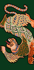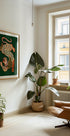 Nápadná abstraktní ilustrace stylizovaného tygra v zářivých barvách na výrazném zeleném pozadí. Umělecké dílo kombinuje geometrické vzory, plynulé linie a zářivé textury a vytváří moderní interpretaci kočičího ducha. Jedinečné umělecké dílo inspirované zvířaty pro milovníky moderního designu.