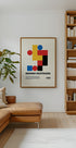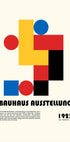 Výrazný výstavní plakát Bauhaus z roku 1923 s výraznými geometrickými tvary v červené, modré, žluté a černé barvě. Tento design inspirovaný vintage vzdává hold hnutí Bauhaus s abstraktními tvary, čistými liniemi a minimalistickým uspořádáním. Nadčasový kus art deco a historie modernistického designu.