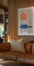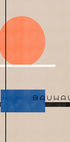 Minimalistický plakát inspirovaný Bauhausem s výraznými geometrickými tvary, včetně velkého oranžového kruhu a výrazného modrého obdélníku na béžovém pozadí. Přímé linie a jednoduché kontrasty dělají z tohoto uměleckého díla nadčasový prvek v moderních i historických interiérech.