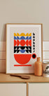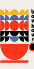 Barevný plakát inspirovaný Bauhausem s geometrickými tvary uspořádanými jako šálek kávy. Tento retro design s výraznými červenými, žlutými, modrými a černými prvky přináší nostalgický nádech 70. let do moderních interiérů. Perfektní do kuchyní, kaváren nebo pro každého, kdo miluje vintage design s nádechem Bauhausu.