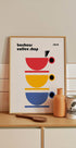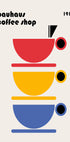 Plakát kavárny inspirovaný Bauhausem z roku 1919 se třemi naskládanými šálky v červené, žluté a modré s výraznými geometrickými tvary. Minimalistický a přesto živý design vyjadřuje uměleckého ducha modernismu a kavárenské kultury. Perfektní nástěnné umění pro kuchyně, kavárny a milovníky stylu Bauhaus.