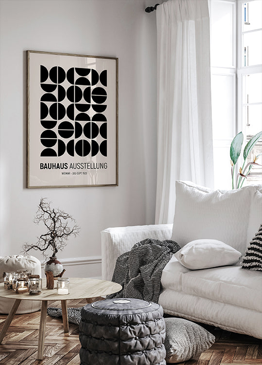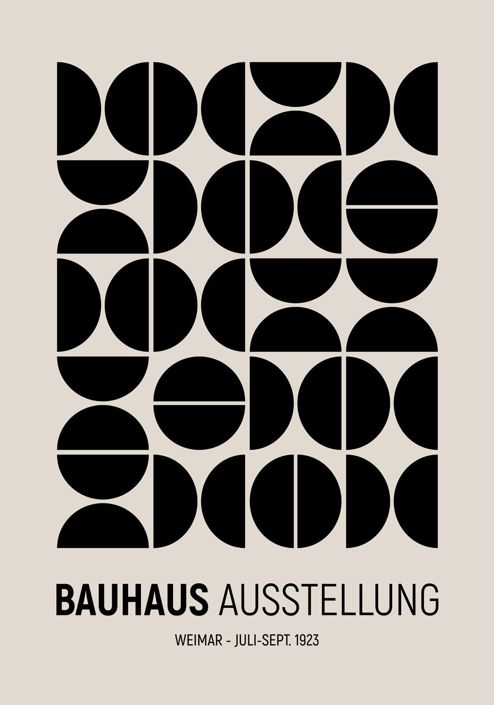 Tento grafický plakát, inspirovaný výstavou Bauhaus z roku 1923, ukazuje krásu jednoduchosti s černými tvary v systematických řadách. Vizuální pocta modernistickému hnutí.