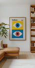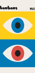 Výrazný plakát inspirovaný Bauhausem se dvěma stylizovanými očima ve výrazných barevných blocích žluté, modré, červené a černé. Tento abstraktní design zachycuje podstatu Bauhausu 1923 s kombinací minimalistických tvarů a nápadných kontrastů. Ideální pro ty, kteří milují vintage, ikonický a modernistický design.