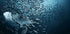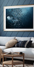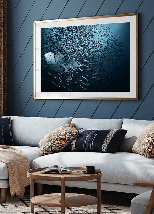 Úchvatný podvodní plakát s mořskou želvou klouzající vířícím hejnem ryb v temně modrém moři. Toto téma natočené na Similanských ostrovech v Thajsku zachycuje krásu a chaos mořského života.