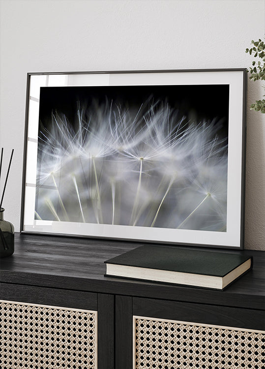 Jemná makrofotografie semen pampelišky, zachycující jejich péřovou jemnost a krásu. Detailní záběr zdůrazňuje křehkou a pomíjivou povahu těchto vzdušných chomáčů.