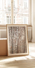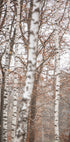 Poklidná lesní scéna se štíhlými břízami stojícími vysoko s bílou kůrou na tlumeném podzimním a zimním pozadí. Jemné větvičky a zbývající listy vytvářejí poetickou atmosféru, která spojuje teplo podzimu s klidem zimy. Ideální pro milovníky přírody a útulných domovů.
