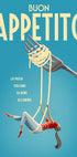 Barevný a hravý plakát inspirovaný Itálií s ilustrací ženy houpající se na nitích těstovin omotaných kolem vidličky. S nápadným textem Dobrou chuť k jídlu oslavuje radost z italského jídla a jeho oduševnělé pohodlí, směs humoru a stylu v poutavém uměleckém díle.