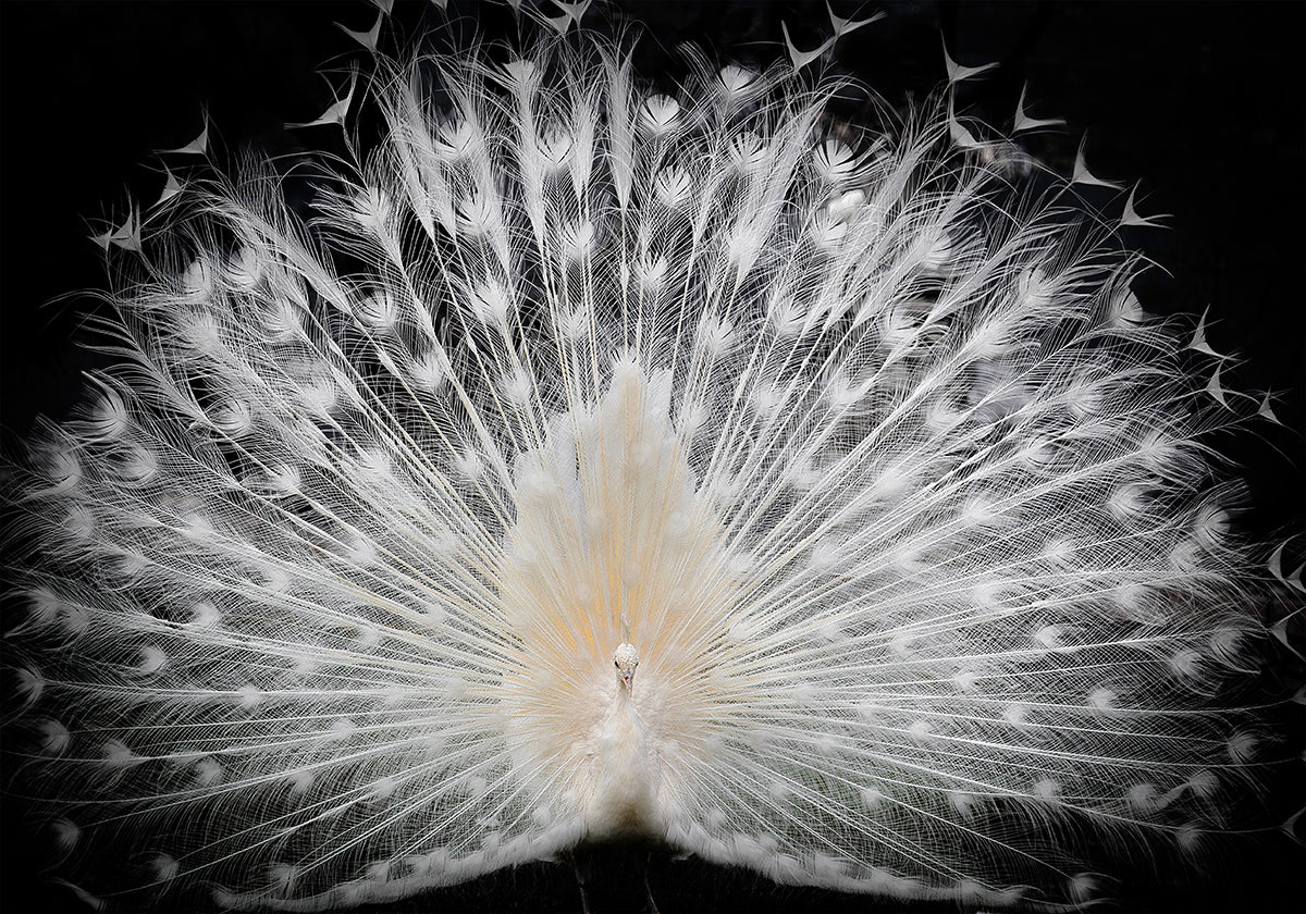 Úchvatná fotografie vzácného bílého páva s plně roztaženým peřím, které tvoří složitý a jemný vzor čisté elegance. Tento poutavý umělecký kus symbolizuje krásu, půvab a vzácnost a stává se fascinujícím ústředním bodem každé dekorace.