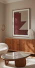 Moderní, minimalistický plakát s geometrickými tvary v tmavě červených a vínových odstínech. Ostré linie a překrývající se povrchy vytvářejí rytmus a rovnováhu, zatímco diskrétní texturované pozadí poskytuje hloubku. Grafické vyjádření, které dodává teplo, klid a eleganci do obývacího pokoje, kanceláře nebo vstupní haly. Ideální pro severskou dekoraci.