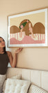 Hravá a stylová ilustrace šampaňského podávaného v posteli s rukama s červenými nehty držící láhev a sklenici na útulném pruhovaném povlečení. Tento potisk vyzařující radost, oslavu a moderní kouzlo je dokonalým doplňkem pro interiéry inspirované radostí, relaxací a stylovými životními okamžiky.