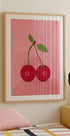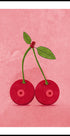 Hravá a živá ilustrace dvou třešní s listy na texturovaném růžovém pozadí. Odvážný, zábavný a barevný – tento design přináší svěží dech humoru do kuchyní, jídelen nebo moderních interiérů a představuje svérázné prohlášení pro každého, kdo miluje umění inspirované ovocem.