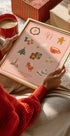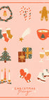 A playful bingo-style illustration bursting with festive icons: Santa hats, gingerbread men, mittens, skates, snowflakes, candles, candy canes, champagne and winter treats. Graphic squares invite family fun and seasonal cheer, mixing vintage charm with modern whimsy for a joyful Christmas focal point.