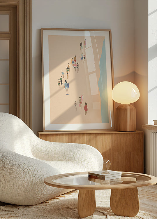 Jednoduchá a klidná ilustrace plážových turistů mířících k moři, namalovaná v jemných pastelových barvách. Ideální pro vytvoření lehké a uvolněné atmosféry v letních domech nebo plážových domcích.