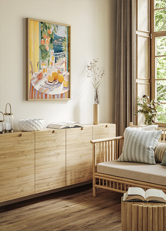 Teplé a slunečné ráno na terase s výhledem na moře – plné citronů, květin a barevné keramiky. Obraz zachycuje podstatu pohodového středomořského života a radost z klidného letního rána.