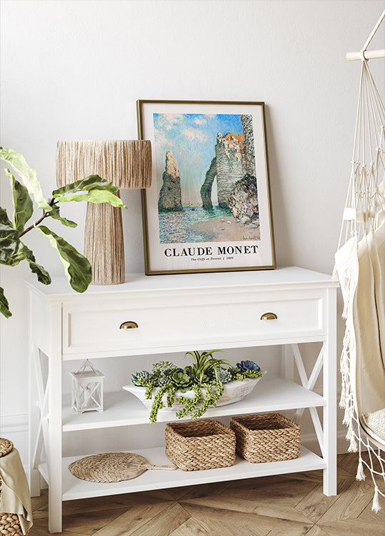 Úchvatný impresionistický obraz od Clauda Moneta zobrazující ikonické útesy Étretatu. Tato klasická přímořská krajina svými charakteristickými tahy štětcem a barvami odrážejícími světlo zachycuje syrovou krásu přírody. Ideální pro milovníky umění a obdivovatele Moneta.
