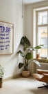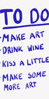 Hravý a motivační typografický kus s ručně psaným seznamem „To Do“: Dělejte umění, pijte víno, trochu se líbejte, dělejte více umění. Tento zábavný a moderní plakát s výrazným modrým textem na bílém pozadí kombinuje humor, romantiku a kreativitu – ideální pro páry, umělce nebo kohokoli, kdo miluje život s vášní.