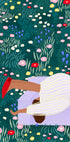 Rozmarná a radostná ilustrace ženy ležící na louce plné barevných květin. Díky zářivým barvám, hravým detailům a pocitu relaxace toto umělecké dílo zachycuje krásu všímavosti, léta a denního snění v přírodě.