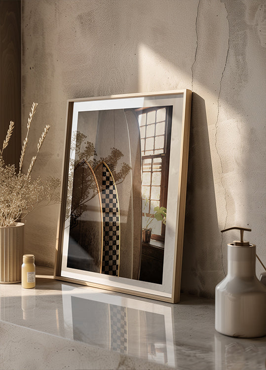 Toto pobřežní zátiší zalité sluncem a klidné v sobě spojuje elegantní béžové surfovací prkno s bujnými listy monstery, které vrhají měkké stíny na minimalistickou zeď. Šepot slaného vzduchu a víkendového útěku, vyvažuje sport a botanický klid – moderní óda na surfařskou kulturu, zachycená fotografem Shot by Clint. V teplých, sluncem políbených tónech.