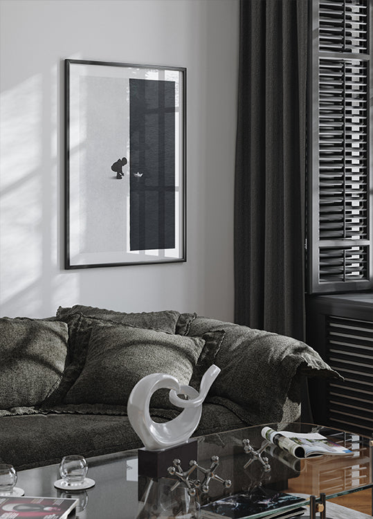 Působivé a symbolické umělecké dílo zobrazující dítě sedící na okraji ostré černobílé propasti a pozorující křehkou papírovou lodičku, jak se vzdaluje. Tato minimalistická kompozice s vysokým kontrastem evokuje témata dětského úžasu, odloučení a rozjímání. Ideální pro moderní interiéry, milovníky konceptuálního umění a ty, kteří oceňují promyšlený design.