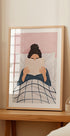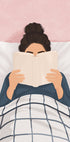 Klidná a útulná ilustrace ženy, která si čte v posteli před světle růžovou zdí. Práce vyzařuje klid, péči o sebe a teplo – ideální pro ložnice, čtecí koutky a další uvolněná místa.