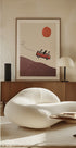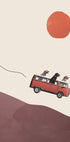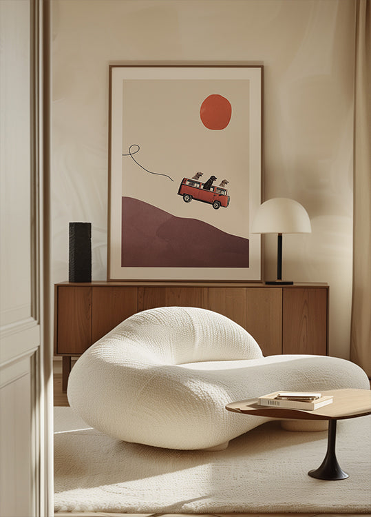 Hravý a vtipný plakát se psy jezdícími červeným autobusem VW přes zvlněné kopce pod silným sluncem. Se svým osobitým stylem koláže, retro atmosférou a zábavnými výrazy zachycuje umělecké dílo ducha svobody, dobrodružství a přátelství.