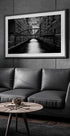 Dramatická, monochromatická cesta hamburskou čtvrtí kanálů: cihlové fasády a nízký most přitahují zrak k obzoru, zatímco tichá voda odráží světlo a stín. Stefan Eisele zachycuje chladný klid města těsnými liniemi, symetrií a hloubkou – městský motiv, který vybízí ke kontemplaci. Motiv vzdává hold nadčasové geometrii Speicherstadtu.
