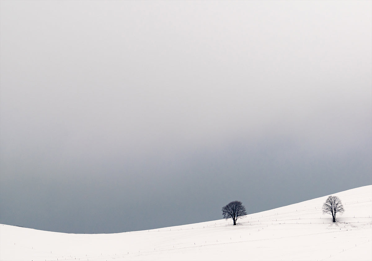 Two Alone od Hugha Warrena zachycuje ticho zasněženého údolí: měkké svahy, plot a dvě osamělé siluety v dálce, které drží pohromadě v bílé. Tmavé stromy rámují scénu a naznačují hloubku lesa, zatímco tlumené světlo dodává subjektu poetický klid a pocit nadčasové zimy. Motiv, který vypovídá o klidu a přítomnosti.