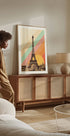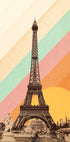 Poutavá retro-inspirovaná ilustrace Eiffelovy věže v Paříži na výrazném duhovém pruhovaném pozadí s teplým zlatým sluncem. Kombinace vintage fotografie a živého grafického designu vytváří nostalgické, ale moderní umělecké dílo inspirované cestováním, ideální pro milovníky Paříže, architektury a barevných dekorací stěn.