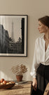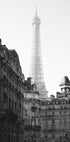 Nadčasová černobílá fotografie Eiffelovy věže tyčící se nad elegantními haussmannovskými budovami Paříže. Jemné světlo a rafinovaný kontrast zvýrazňují romantickou duši města, díky čemuž je tento tisk ikonickou volbou pro milovníky cestování, architektury a klasického evropského šarmu.