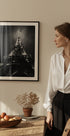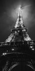 Nápadná černobílá fotografie Eiffelovy věže osvětlená proti noční obloze v Paříži. Dramatický úhel a zářící světla zachycují majestátnost památky a činí z tohoto tisku silnou výpověď v interiérech, které oslavují cestování, architekturu a nadčasovou romantiku Města světla.