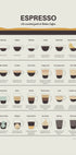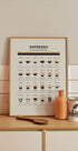 Detailní plakát na espresso s ilustrovaným přehledem klasických italských kávových nápojů. Od espressa a doppia po cappuccino, latte a affogato – tento plakát do kuchyně je vzdělávací i stylový. Perfektní nástěnné umění pro kavárny, kavárny a domácí kuchyně.