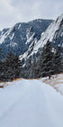 Ještě zimní moment z ikonických Flatirons Boulder: sněhem pokrytá stezka v parku Chautauqua vede k rozeklaným útesům, zatímco tmavě zelené borovice a světlá mlha vytvářejí chladnou, ponurou náladu. Nad vším visí zatažená obloha a klid přírody je téměř slyšet. Fotografie od Del Mundo Imagery.