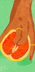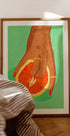 Grapefruit dotykový plakát je nápadné a provokativní moderní umělecké dílo, které zkoumá témata smyslnosti, síly a hravé vzpoury. Zobrazuje ruku s tmavě hnědou kůží, zdobenou zlatými prsteny a výraznými červeně nalakovanými nehty, rámující rozpůlený grapefruit v symbolickém a sugestivním gestu. Na svěžím, texturovaném zeleném pozadí vytvářejí teplé tóny ruky a ovoce podmanivý kontrast. Tento odvážný kousek je ideální pro současné prostory, které zahrnují pozitivitu těla, sebevyjádření a bezpodmínečnou sebedůvěru.
