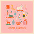 Růžová nostalgická vánoční ilustrace plná malých, okouzlujících vánočních motivů, jako jsou dárky, sobi, vánoční ozdoby, hračkový robot, dort, vánoční stromeček a tyčinky. Styl je retro a barvy jemné a teplé, dole je napsán text "Merry Christmas".