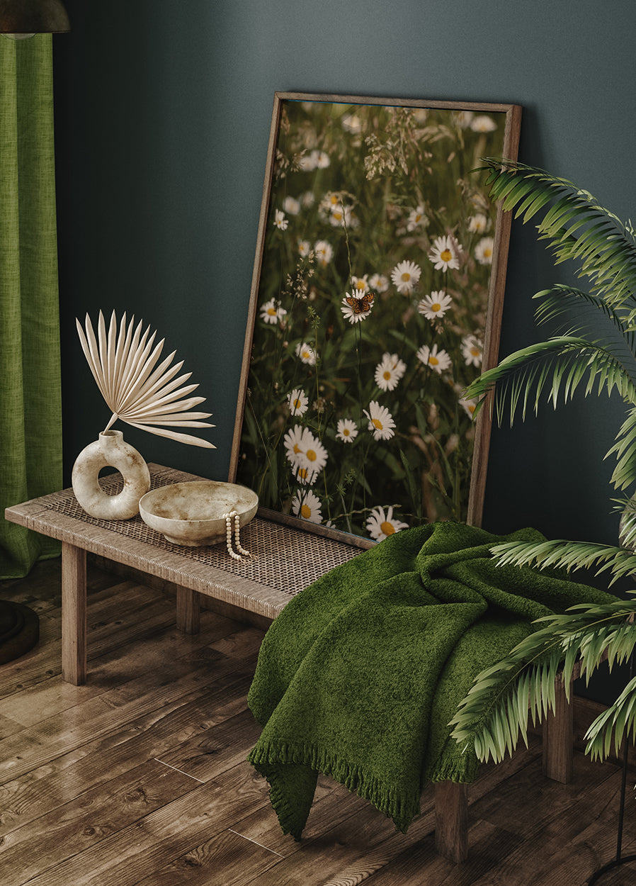 Jemný a moderní plakát s motivem heřmánkových květů a motýla. Ideální pro dodání klidné a přirozené atmosféry do jakékoli místnosti, ať už doma nebo v kanceláři.