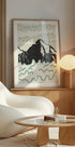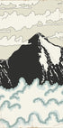 Čistý, minimalistický horský plakát od Nicholase: majestátní vrchol se tyčí nad vrstvenými hřebeny uhlí a břidlice, koupající se na bledé obloze s přeháňkami. Jemné, vintage inspirované textury a lehké opotřebení dodávají hloubku a klid, zatímco pohled směřuje do dálky a probouzí touhu po dobrodružství. Ideální pro severský interiérový design a sen o nových výšinách.