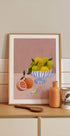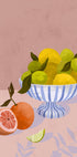 Okouzlující ilustrace zátiší s pruhovanou mísou naplněnou citrony a limetkami, doplněná nakrájeným krvavým pomerančem a plátkem limetky. S teplými tóny a malebnými texturami přináší toto umělecké dílo svěží atmosféru inspirovanou Středozemním mořem, která je ideální do kuchyně nebo jídelny.