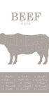 Minimalistický a vzdělávací plakát do kuchyně zobrazující krávu s vyznačenými kusy masa, od žeber a svíčkové po bok a prsa. Navrženo v neutrálních barvách s jasnou typografií, je to stylový a informativní kus nástěnného umění ideální pro kuchyně, řeznictví, restaurace nebo venkovské interiéry.