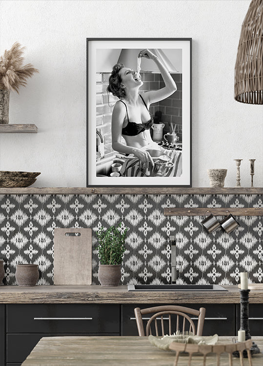 Hravá a odvážná černobílá fotografie ženy vychutnávající si špagety ve vintage kuchyni. S uvolněným přístupem vyzařuje sebevědomí a humor, díky čemuž je toto umělecké dílo stylovým a zábavným doplňkem moderních interiérů. Ideální pro výzdobu kuchyní, gurmány a nadšence fotografování.