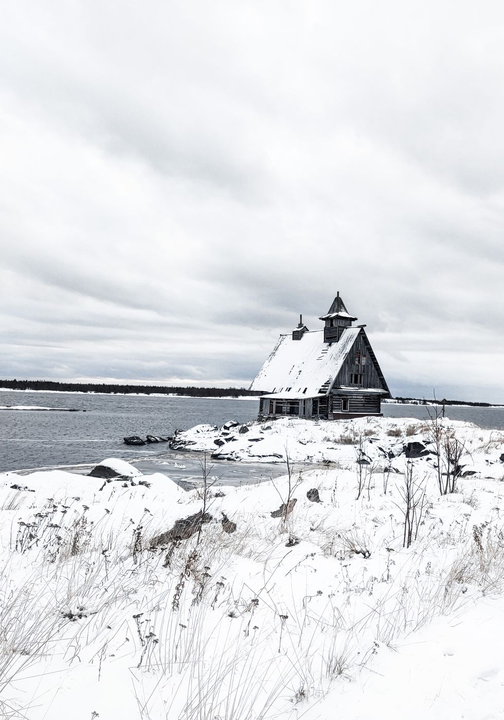 Sugestivní fotografie opuštěného dřevěného srubu stojícího osamoceně u zamrzlého jezera, obklopeného klidnou zasněženou krajinou. Tlumené barvy a otevřené nebe vytvářejí pocit samoty, tajemna a syrové krásy nedotčené přírody. Ideální pro milovníky severské estetiky, minimalismu a zimní krajiny.