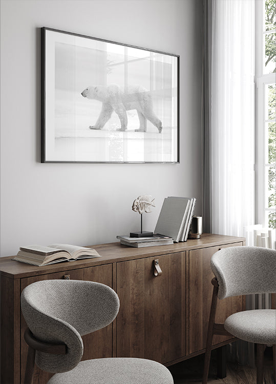 Et højlyst, minimalistisk motiv af en ensom isbjørn, der vandrer gennem det sneklædte arktiske landskab ved Churchill, Canada. Marco Pozzi fanger kuldens stille poesi i rene hvide nuancer, hvor spor i sneen og dyrets rolige blik skaber en rolig, tidløs stemning og nordisk elegance. Et motiv, der bringer naturens storhed ind i hjemmet.