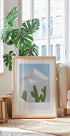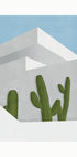 Moderní pouštní estetika ožívá v této minimalistické ilustraci s vysokými zelenými kaktusy orámovanými čistými architektonickými liniemi a klidnou modrou oblohou. Interakce mezi světlem, stínem a geometrií zachycuje sluncem zalitý moment na nádvoří – pozoruhodný plakát pro moderní a přírodou inspirované interiéry.