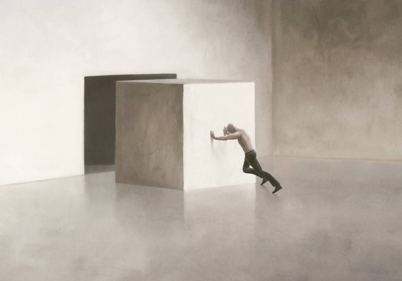 Působivé minimalistické umělecké dílo zobrazující osamělou postavu tlačící se na obří krychli. Tento surrealistický obraz symbolizuje boj, vytrvalost a životní výzvy. Ideální plakát pro ty, kteří oceňují hluboké, podnětné umění s moderním vyjádřením.